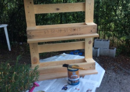 Αφού έχουμε καθαρίσει κ περάσει με γυαλόχαρτο την παλέτα,κολλάμε τα ξύλα για να κλείσουμε κ να δημιουργήσαμε τα εσωτερικά ράφια. Περνάμε με άχρωμο συντηρητικό ξύλου DUROXYL για προστασια της κατασκευής